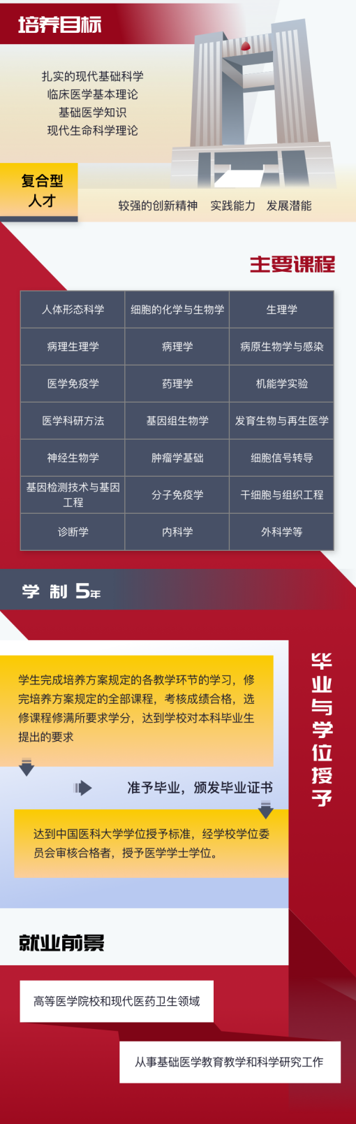 培养目标: 本专业培养具有扎实的现代基础科学和临床医学基本理论,较强的创新精神、实践能力和发展潜能,集基础医学知识和现代生命科学理论于一身的复合型人才。