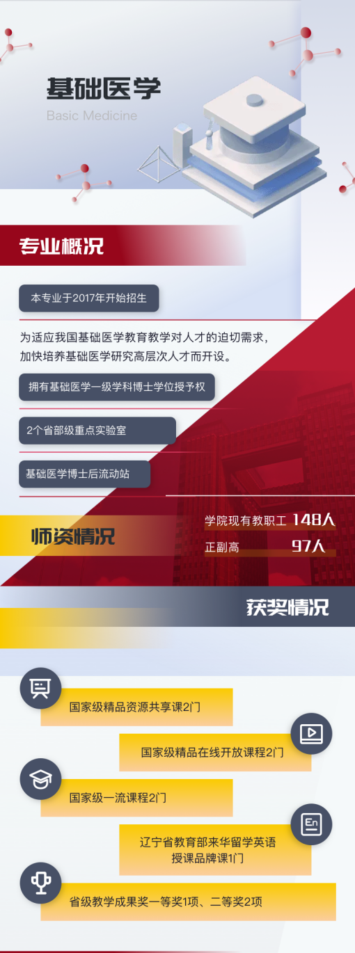 专业概况:本专业于2017年开始招生,为适应我国基础医学教育教学对人才的迫切需求,加快培养基础医学研究高层次人才而开设。拥有基础医学一级学科博士学位授权、一个省部级重点实验室以及基础医学博士后流动站。