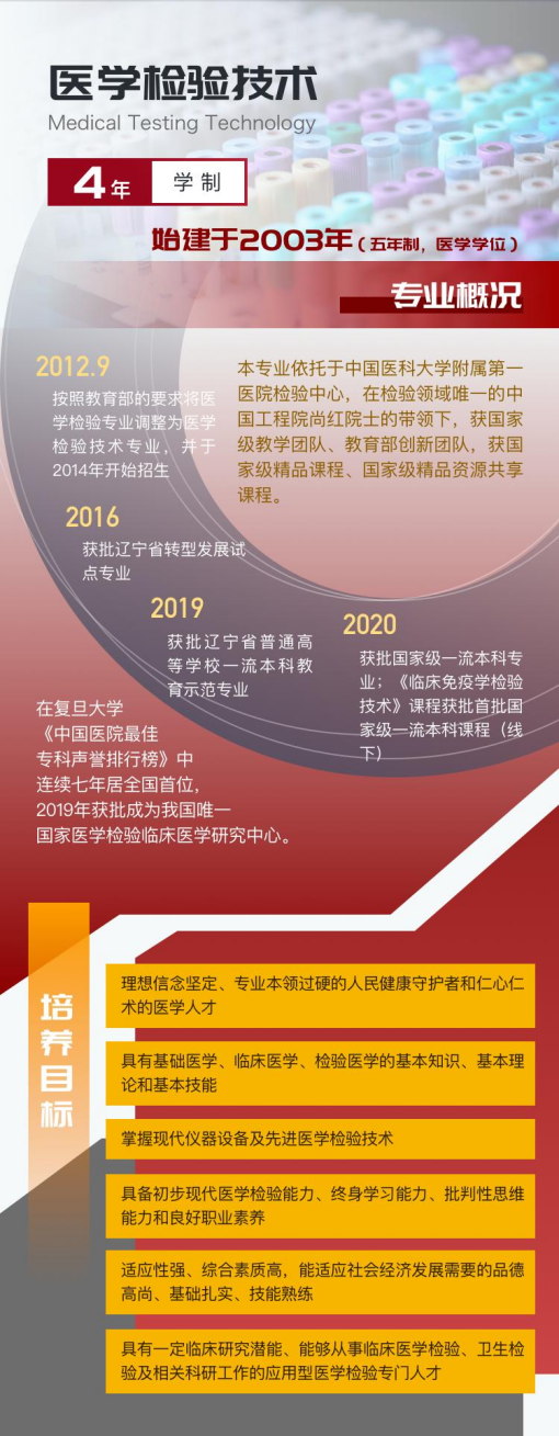 专业概况:本专业创建于2003年,其前身为医学检验专业(五年制,医学学位)。2012年9月,按照教育部的要求将医学检验专业调整为医学检验技术专业,并于2014年开始招生,2016年获批辽宁省转型发展试点专业。本专业依托的中国医科大学附属第一医院检验中心,在复旦大学《中国医院最佳专科声誉排行榜》中连续四年居全国首位,2019年获批成为我国唯一国家医学检验临床医学研究中心。